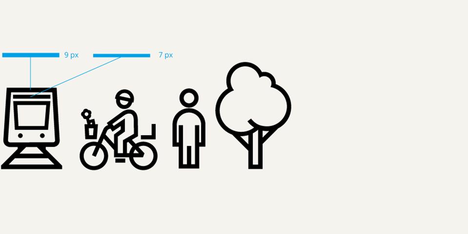 För att ytterligare anpassa våra piktogram och ikoner efter Stockholm Type använder vi tjocka linjer och helst endast en outline. Om en form kräver mer än en outline skalinjen som ligger innanför denna vara smalare.