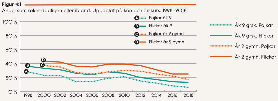 Ett linjediagram där man använt både färger, mönster och bokstäver för att tydliggöra de olika linjerna.