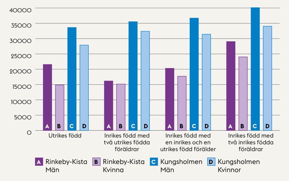 Ett stolpdiagram med flera stolpar där man förtydligar både med färger, ramar och bokstäver.